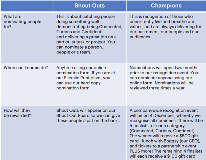 Reward Me is our reward and recognition programme. It celebrates NZME-ers who achieve great things for us and our business by living our values of Connected, Curious and Confident. Reward Me has two tiers of recognition: Shout Outs and NZME Champions