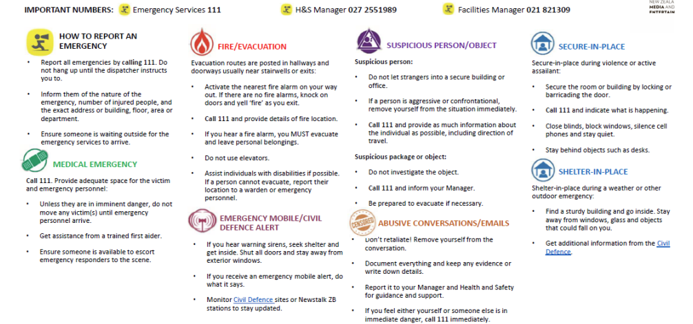 The way NZME continues to grow and fine tune is through sharing our experiences and events and learning from them. The same rings true for health, safety and security. If you are involved in or witness an event that is a risk to someone’s health, safety or security it’s important that you notify your Manager and the Health and Safety team as soon as possible.